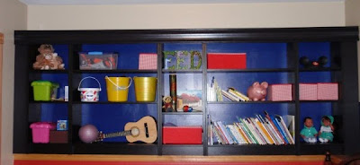 Description: The room is in our basement and has this awkward ledge that runs across two walls. The area above the ledge was always challenging to decorate and seemed like wasted space. This solution provided an architectural focal point for the room as well as the one thing no kiddo can have enough of - storage!