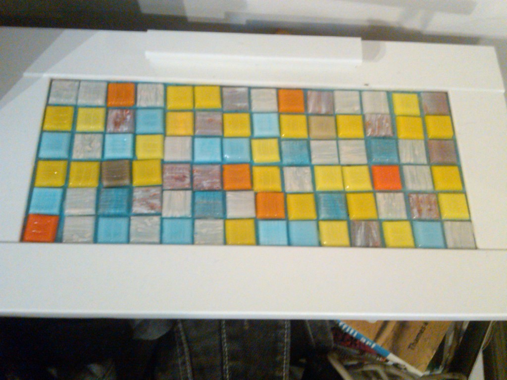 In the end, the recessed plastic panel worked out perfectly for mosaic work. I may replace the square white feet eventually with something more vintage and the drawer-pulls may eventually be replaced by something wrought iron, but for now, much better! Ignore the current paint job in room, that's the next project.