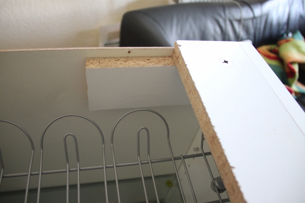 With the jigsaw I cut a rectangle hole in the top of the Faktum cabinet. On the top I used 2 identical chipboards. These are custom made at a online shop (schnitt-stelle.com). To drill the hinge on the back wall of the cabinet, I build a stiffener (you can see on the picture).